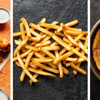Bone-in wings tossed in your choice of 2 flavors, served with fries & 2 sides of ranch.