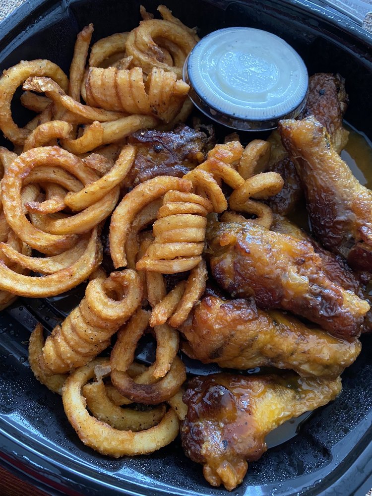 Bone-in wings tossed in your choice of 2 flavors, served with fries, 2 sides of ranch & a drink.
